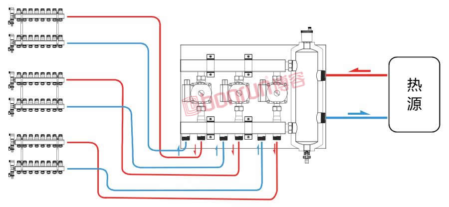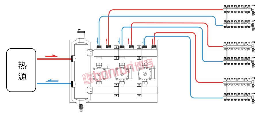 3、均衡各區(qū)域室溫(去耦集成系統(tǒng)讓水泵實現(xiàn)獨立環(huán)路,互不干擾)