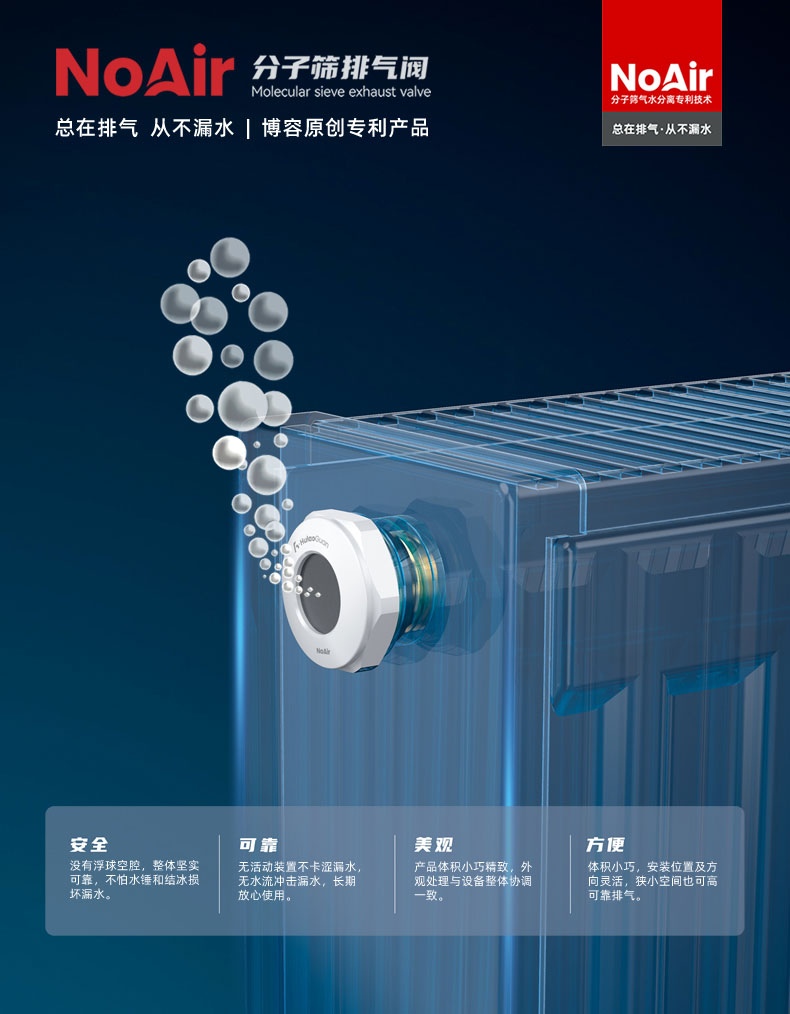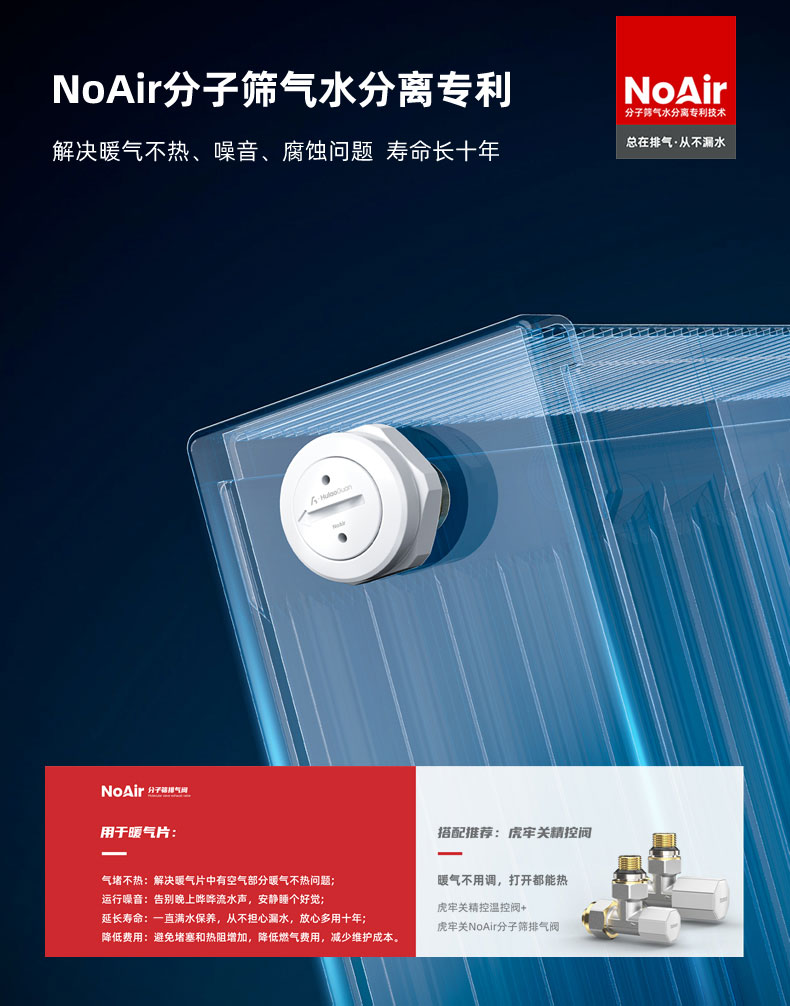 特點(diǎn):采用虎牢關(guān)NoAir分子篩排氣專利技術(shù),暖氣自動滿水狀態(tài),安全排氣從不漏水,解決暖氣片氣堵不熱、生銹腐蝕,運(yùn)行噪音問題。