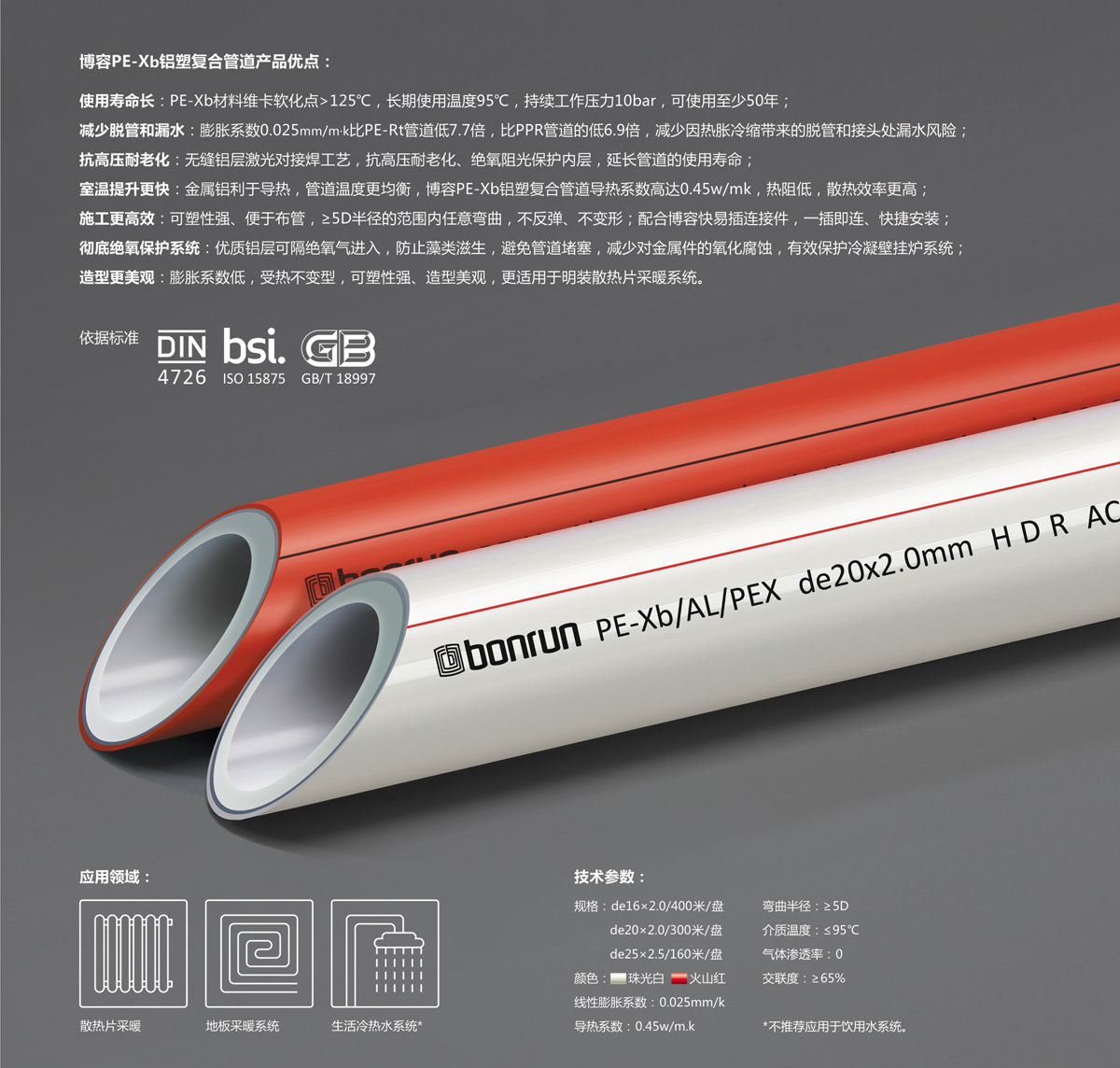 3、導(dǎo)熱系數(shù)高達(dá)0.35W/m.k,特別適用于地暖用管、冷熱給水管。
