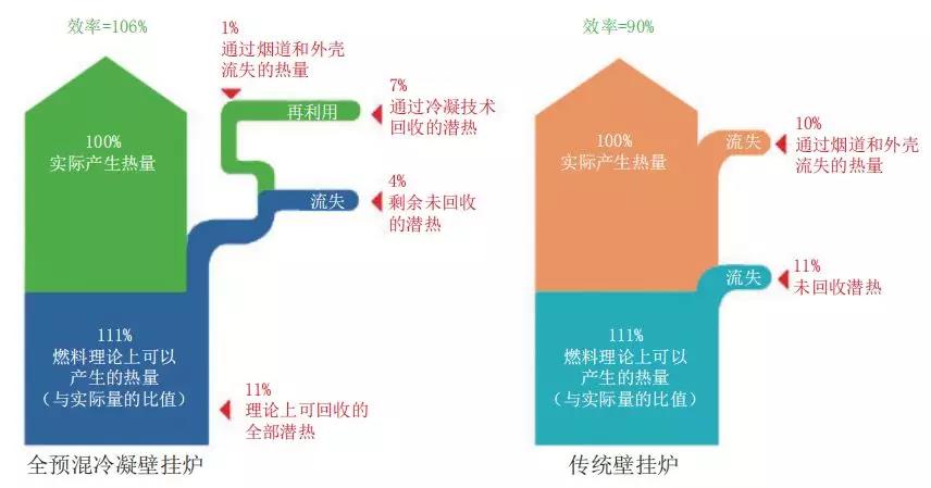 在冷凝壁掛爐中,高效的換熱結(jié)構(gòu)能夠?qū)煔饫鋮s到40℃后進(jìn)行排放,這樣煙氣中的水蒸氣也會(huì)成為凝結(jié)水,并釋放出汽化潛熱讓水帶走,排煙溫度低加上汽化潛熱的吸收使得冷凝壁掛爐效率可達(dá)到109%,幾乎比常規(guī)爐高20%。