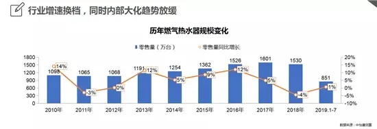 每年國內(nèi)燃?xì)鉄崴麂N量1600萬臺左右,但最近幾年基本處于停滯狀態(tài),從2016年1526萬臺到2018年1530萬臺、2019年前七個月851萬臺,幾乎沒有增長,似乎用戶對熱水的需求進(jìn)入飽和,行業(yè)老化市場面臨天花板。