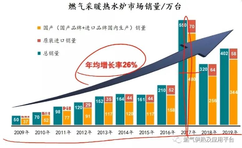 從上面的途中可以看到燃?xì)獗趻鞝t的銷量,從2016年的210萬臺,到2017年的550萬臺(煤改氣的影響),2018年的320萬臺,2019年的402萬臺,雖然受到煤改氣影響有所起伏,但整體還是向上的趨勢,從數(shù)量上已經(jīng)擁有400萬臺年銷量,是熱水器的四分之一。