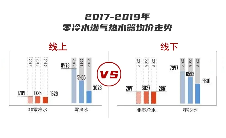 2、線上無論是非零冷水還是零冷水產(chǎn)品價格都要遠(yuǎn)遠(yuǎn)低于線下。2019年線下零冷水產(chǎn)品均價4801元,線上均價3023元,前者幾乎比后者高60%,通常情況下價格越低用戶越容易選擇,線上價格低應(yīng)該有更好的選擇概率。